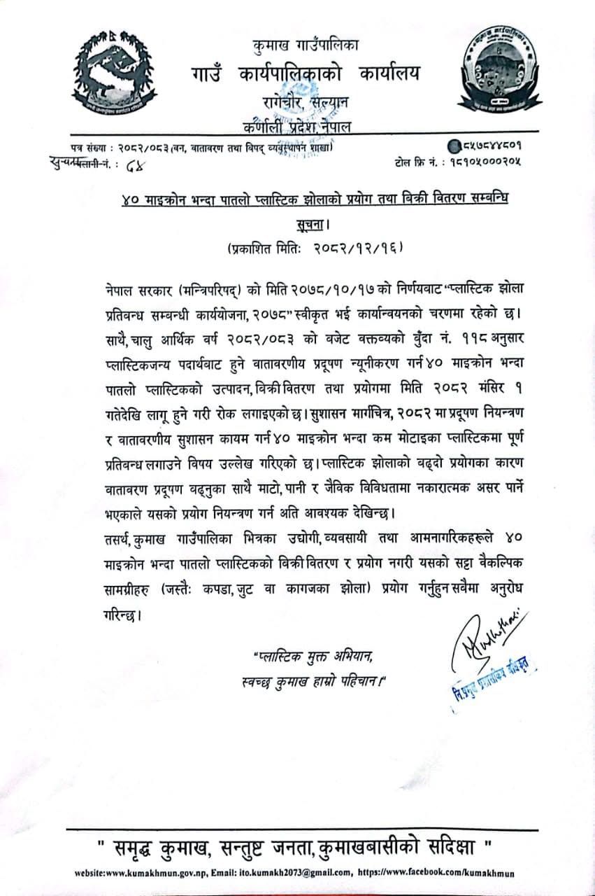 नेपाल सरकारको निर्णय तथा सुशासन मार्गचित्र, २०८२ अनुसार कुमाख गाउँपालिकामा ४० माइक्रोनभन्दा पातलो प्लास्टिक झोलाको उत्पादन, बिक्री वितरण तथा प्रयोगमा कडाइ गरिएको छ। नेपाल सरकार ९मन्त्रिपरिषद्० को २०७८ माघ १७ गतेको निर्णयबाट “प्लास्टिक झोला प्रतिबन्ध सम्बन्धी कार्ययोजना, २०७८” स्वीकृत भई कार्यान्वयनमा आएको र चालु आर्थिक वर्ष २०८२र०८३ को बजेट वक्तव्यको बुँदा नं। ११८ अनुसार २०८२ मंसिर १ गतेदेखि ४० माइक्रोनभन्दा पातलो प्लास्टिक झोलामा रोक लगाइएको थियो। साथै, सुशासन मार्गचित्र, २०८२ ले समेत प्रदूषण नियन्त्रण र वातावरणीय सुशासन कायम गर्न ४० माइक्रोनभन्दा कम मोटाइका प्लास्टिकमा पूर्ण प्रतिबन्धको व्यवस्था गरेको छ। प्लास्टिक झोलाको बढ्दो प्रयोगले वातावरण प्रदूषण बढाउँदै माटो, पानी र जैविक विविधतामा गम्भीर असर पारिरहेको भन्दै यसको नियन्त्रण अपरिहार्य भएको गाउँपालिकाले जनाएको छ।