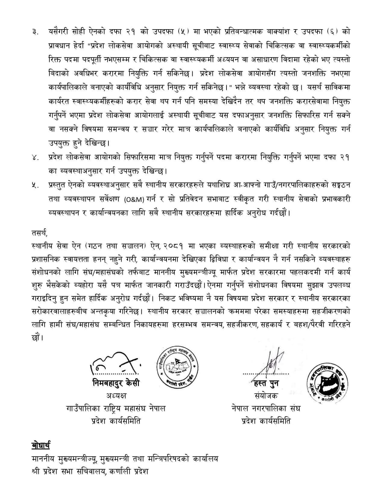 दुबै महासंघ लगायत संयुक्त ट्रेड युनियनले प्रेस विज्ञप्ति निकालेर प्रदेश सरकार र प्रदेशसभा सचिवालयलाई बुझाएको पत्रमा स्थानीय तहले आवश्यक जनशक्ति करारका कर्मचारी (जस्तै चिकित्सक, स्वास्थ्यकर्मी, कम्प्युटर अपरेटर, कार्यालय सहयोगी, प्लम्बर, इलेक्ट्रीसियन, चालक, सरसफाइ कर्मचारी) समयमै करारमा नियुक्ति गर्न नपाउँदा सेवा प्रवाह प्रभावित भएको उल्लेख गरिएको छ । ज्ञापनपत्रमा भनिएको छ, “प्रदेश लोकसेवा आयोगको सिफारिस बिना करारमा जनशक्ति नियुक्ति गर्न नमिल्ने धारणा बनाइँदै आएको छ । तर ऐनको धारा १४ र २१ अनुसार स्थानीय तहले अस्थायी रूपमा करार सेवा लिन सक्ने स्पष्ट व्यवस्था छ।”