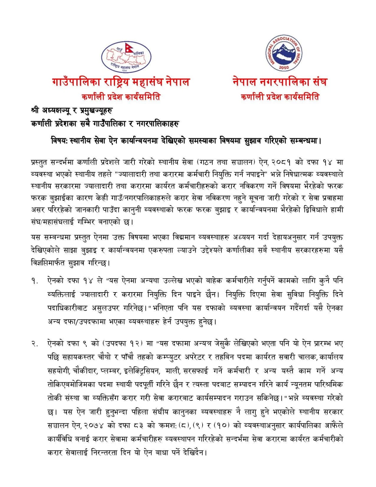 कर्णाली प्रदेशका स्थानीय तहहरूले स्थानीय सेवा (गठन तथा सञ्चालन) ऐन २०८१ कार्यान्वयनमा देखिएको समस्या समाधान गर्न माग गरेका छन् । गाउंपालिका राष्ट्रिय महासंघ नेपाल र नेपाल नगरपालिका संघ कर्णाली प्रदेश कार्यसमितिले संयुक्त रूपमा विज्ञप्ति निकालेर प्रदेश सरकारलाई सुझाव सहित ऐनको अस्पष्ट व्यवस्थाले जनशक्ति व्यवस्थापनमा समस्या निम्तिएको बताएका हुन् ।