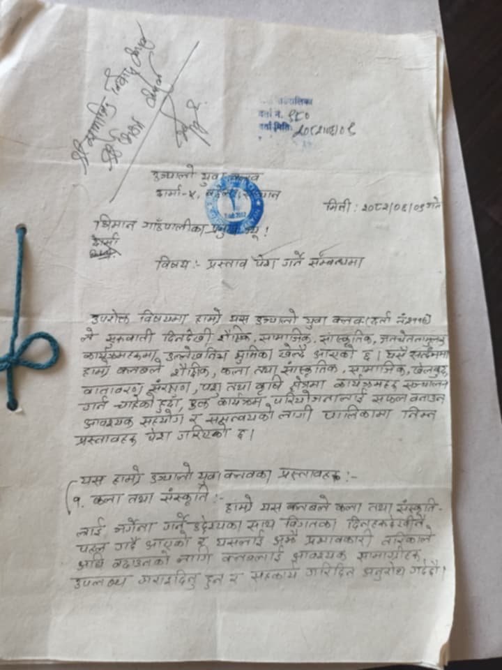 क्लबका अध्यक्ष दिपेश खड्का र सचिव घनराज खड्काले लिखित प्रस्ताव पालिकामा बुझाउँदा क्लबका लेखा संयोजक नवीन खड्का र व्यवस्थापन समिति अध्यक्ष रामचन्द्र खड्का समेत सहभागी रहनुभएकोथियो । क्लबका सचिव घनराज खड्काका अनुसार प्रस्ताव तयार पार्नुअघि असोज ७ गते भौतिक भेला तथा अनलाइन छलफल गरिएको थियो । उक्त छलफलमा सहभागी सबै युवाहरूका सुझाव र गुनासाहरू समेटी साझा दस्तावेजको रूपमा प्रस्ताव तयार गरिएको हो । सचिव खड्काका अनुसार, “यो प्रस्ताव केवल कागजमा सिमित नभएर पालिकाले यसलाई व्यवहारमा उतार्न सक्दो पहल गर्नुपर्ने बताउनु भयो । युवाको आवाज अझै पनि बेवास्ता गरिएमा थप कदम चाल्न बाध्य हुने बताउनु भयो ।