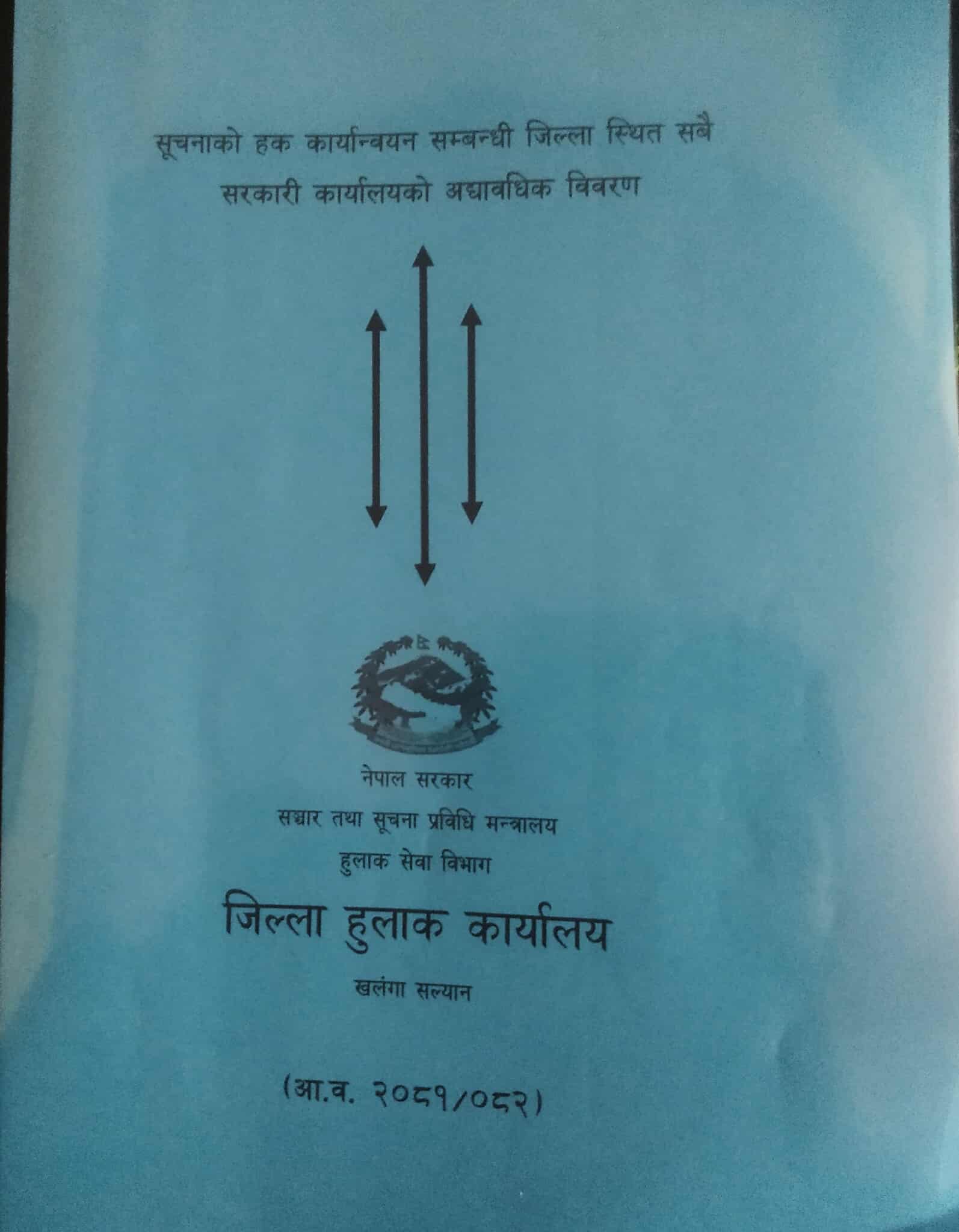 त्यस्तै, बिहीबार (आज) सूचना हक कार्यान्वयनसम्बन्धी जिल्ला स्थित सबै कार्यालयहरूको अद्यावधिक विवरण जिल्ला हुलाक कार्यालयले जिल्ला प्रशासन कार्यालय र नेपाल पत्रकार महासंघ सल्यान शाखालाई बुझाएको छ ।